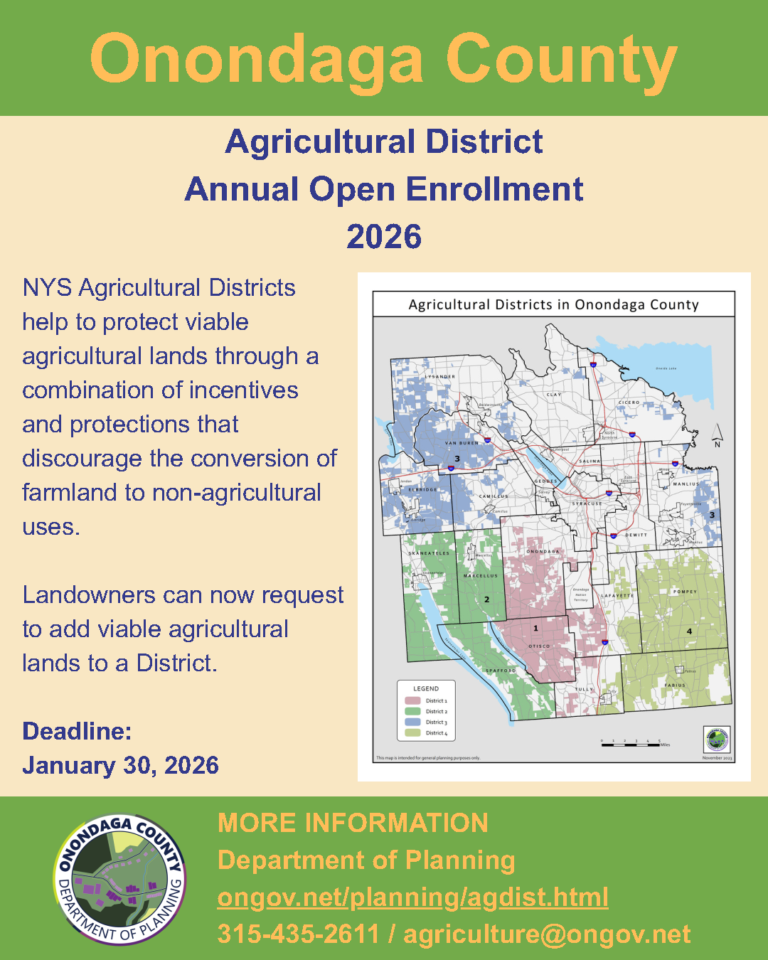 Explore the Onondaga County “Ag Mapper” to determine if your land is already in an Agricultural District: https://socpa.maps.arcgis.com/apps/webappviewer/index.html?id=1ae5312cc92c4add939f56f4dbc622fd