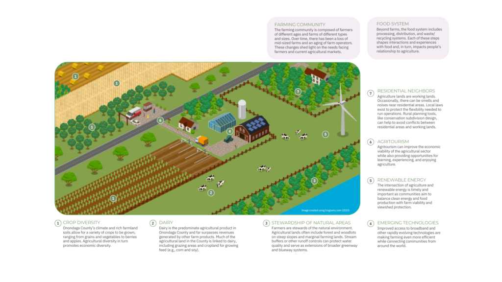 Understanding the different components that make up Onondaga County’s agricultural system is an important first step toward County-wide recommendations and investments. The diagram below depicts the complexity of farms which undergo constant pressure to find and keep land in production, transport crops to market, and keep operations viable.