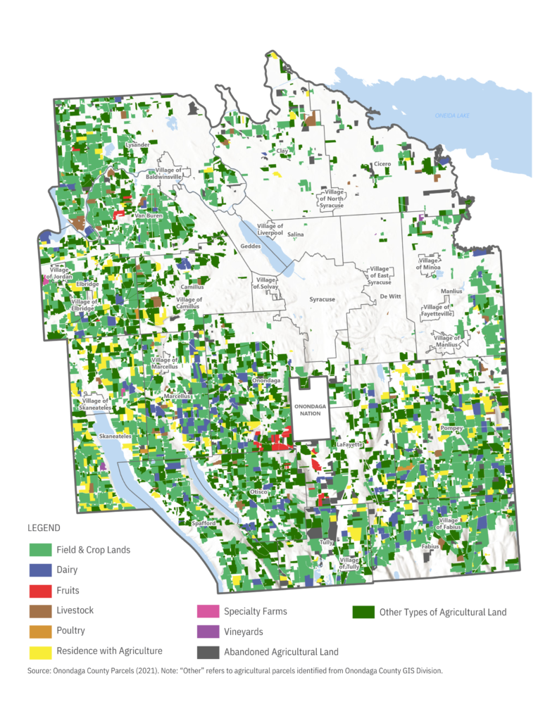 Approximately 1/3 of Onondaga County is in agricultural production. Farmland is primarily concentrated in the western and southern portions of the County, although there is a diverse array occurring in the northern and eastern areas as well. Urban farms, community gardens, and edible forests have emerged in urban areas, too.