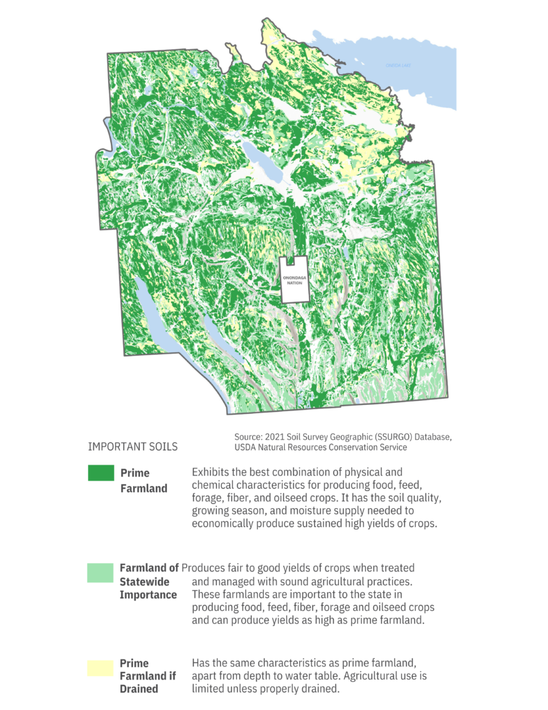 Nearly 70% of the County’s total land area has been classified as Prime Farmland and Farmland of Statewide Importance. These prized agricultural soils in Onondaga County are plentiful but are relatively rare globally. The temperate climate of Central New York and freshwater availability make local soils particularly good for a variety of food crops and agriculture uses.