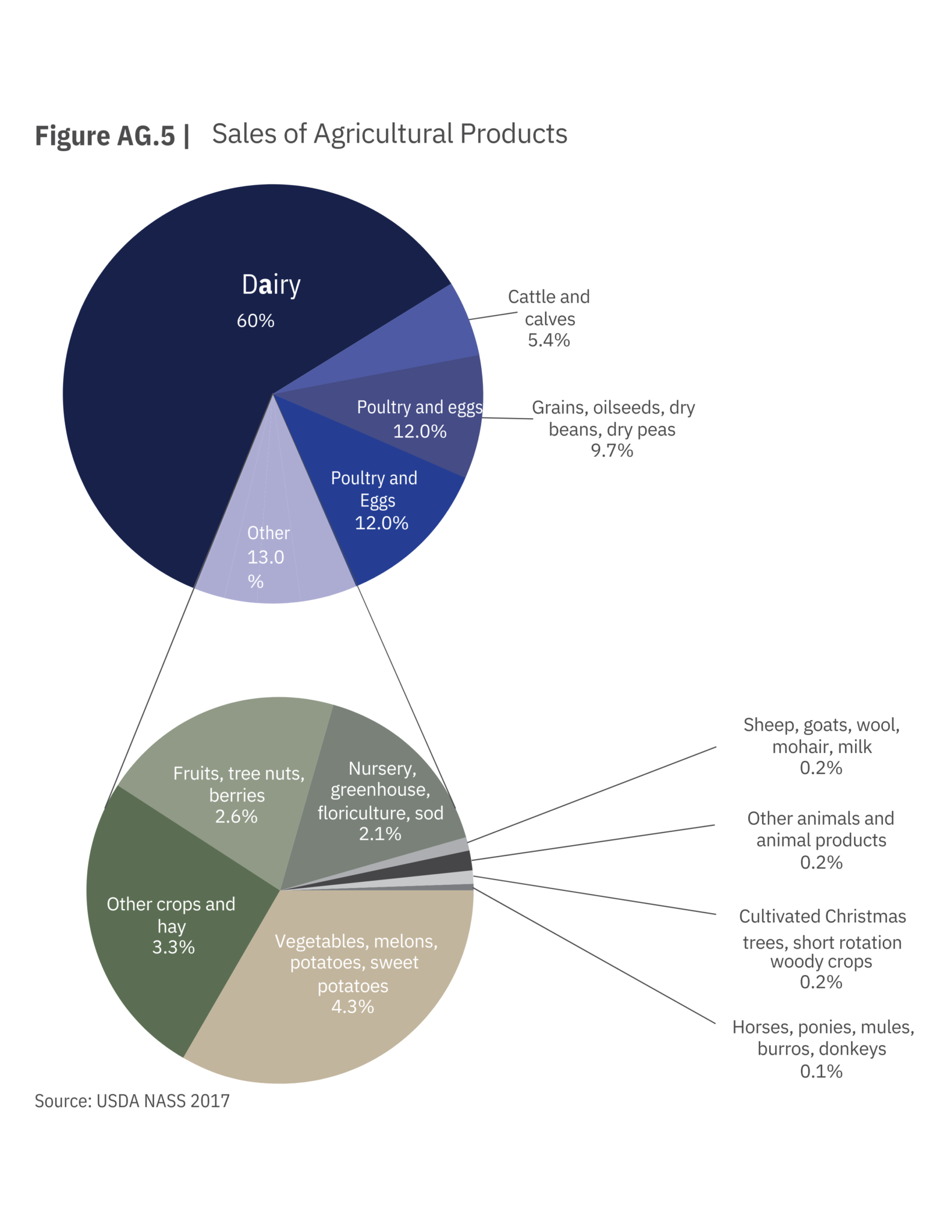 The local agricultural industry is dominated by dairy production but also features a wide diversity of operations including vegetables, fruits, tree nuts, and berries, and nursery, greenhouse, and floriculture production.